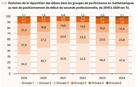 Les élèves de seconde professionnelle progressent aussi : leur score moyen passe de 199,8 à 205,4 points en un an (+5,6 points). Toutefois, 71,2 % d’entre eux se situent encore dans les groupes les plus faibles. À l’autre bout du spectre, seuls 5,6 % atteignent les groupes les plus performants. L’écart avec la voie générale reste conséquent : 55 points de différence en moyenne.