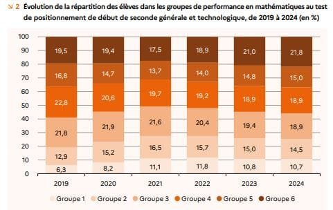 En septembre 2024, plus de 700 000 élèves ont passé ce test de mathématiques. Le score moyen pour les élèves de la voie générale et technologique est de 260,4 points, en hausse de 3,8 points par rapport à 2022. On observe également une baisse de la proportion d’élèves en grande difficulté (groupes 1 et 2), qui passe à 25,2 %, tandis que les groupes les plus performants (groupes 5 et 6) gagnent 1 point pour atteindre 36,8 %.